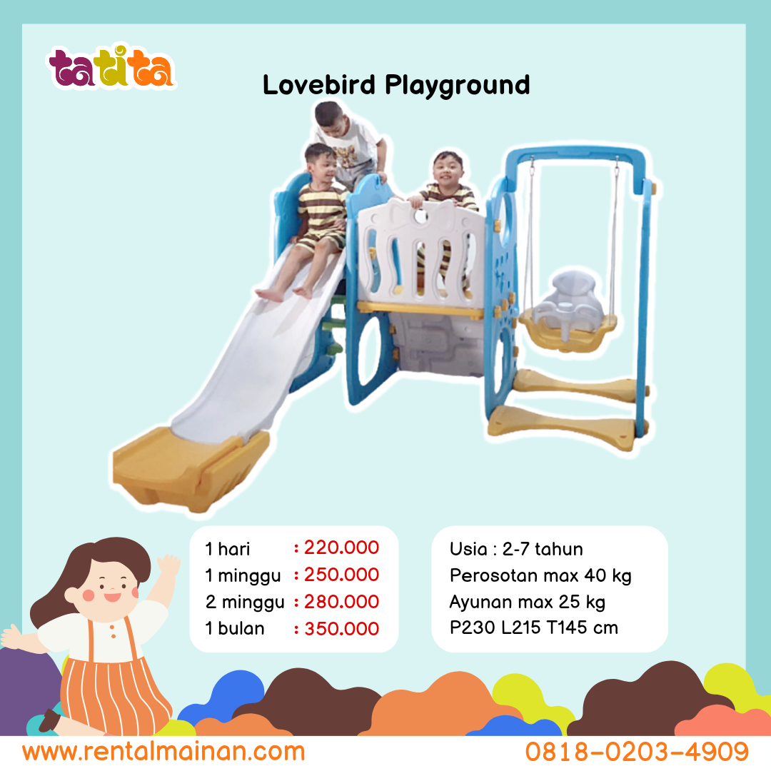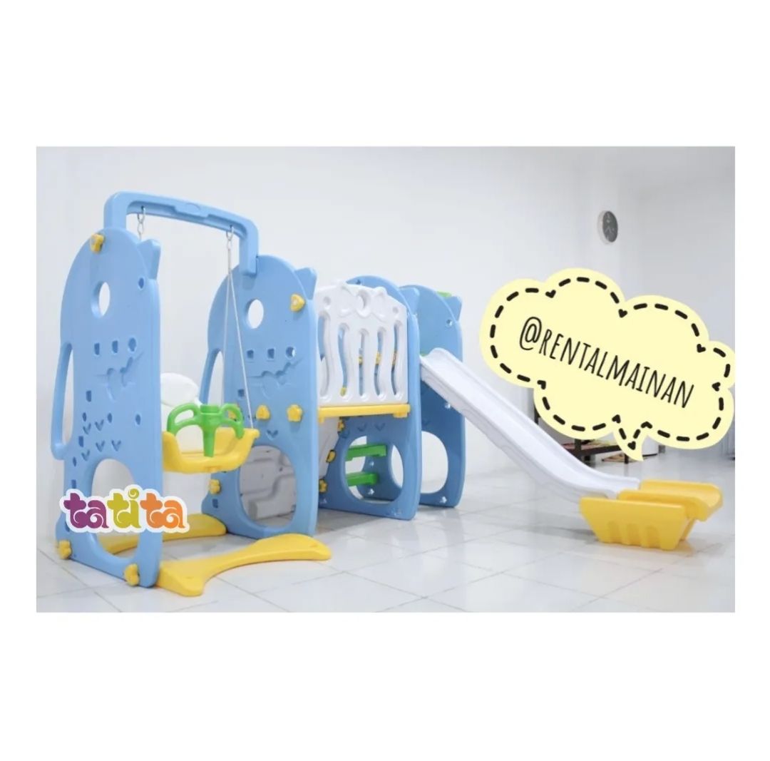 Mainan perosotan dan ayunan yang dilengkapi dengan terowongan, pendakian dan ring basket.