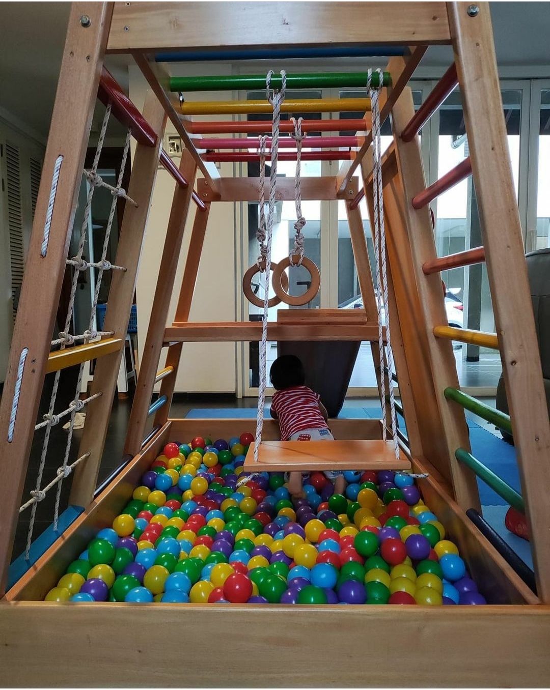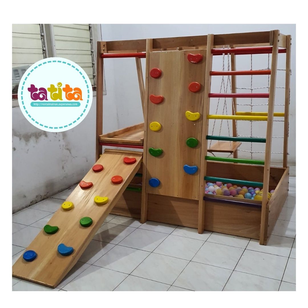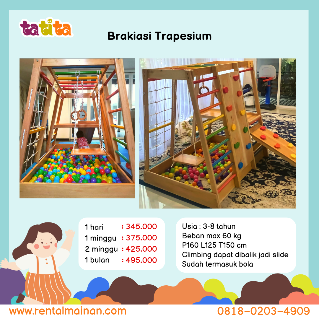 Tangga brakiasi didesain untuk bergelantungan sehingga mampu melatih otot dan ketangkasan anak. Dilengkapi dengan bak kolam yang dapat diisi dengan bola untuk mandi bola. Manfaat lainnya yaitu mengembangkan kemampuan motorik kasar anak, mengontrol keseimbangan, kreativitas, percaya diri, strategi, problem solving, fokus/konsentrasi. Brakiasi adalah alat yang sangat berguna dan sangat bermanfaat untuk pertumbuhan otak dan tubuh, karena ia mampu membangun paru-paru serta memperkuat tubuh bagian atas. Terbuat dari kayu mahoni finishing waterbase, diamplas halus dan beeswax (foodgrade, jadi aman untuk anak)