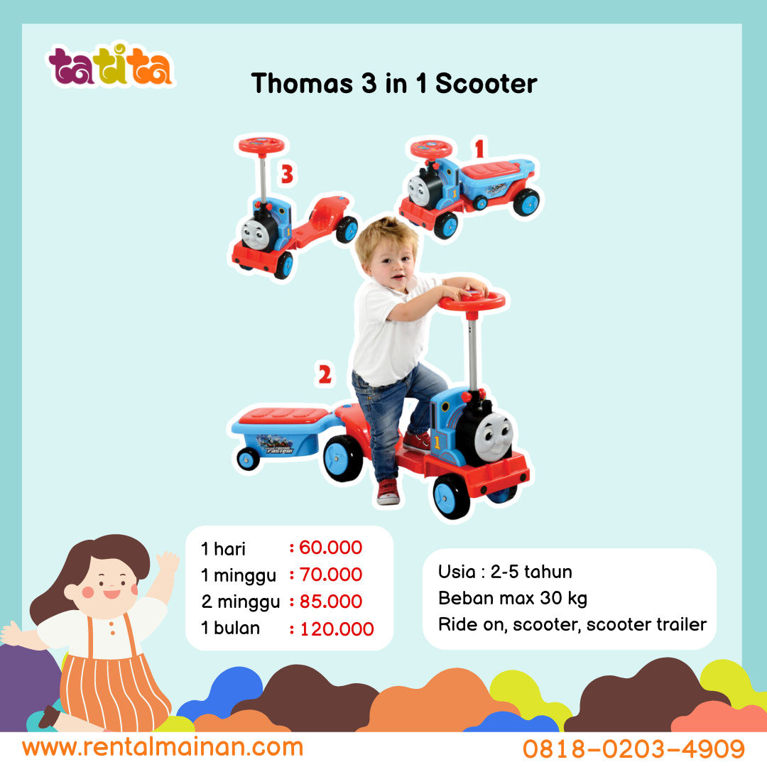 Karakter Thomas yang menggemaskan dalam bentuk scooter yang memiliki 3 fungsi.